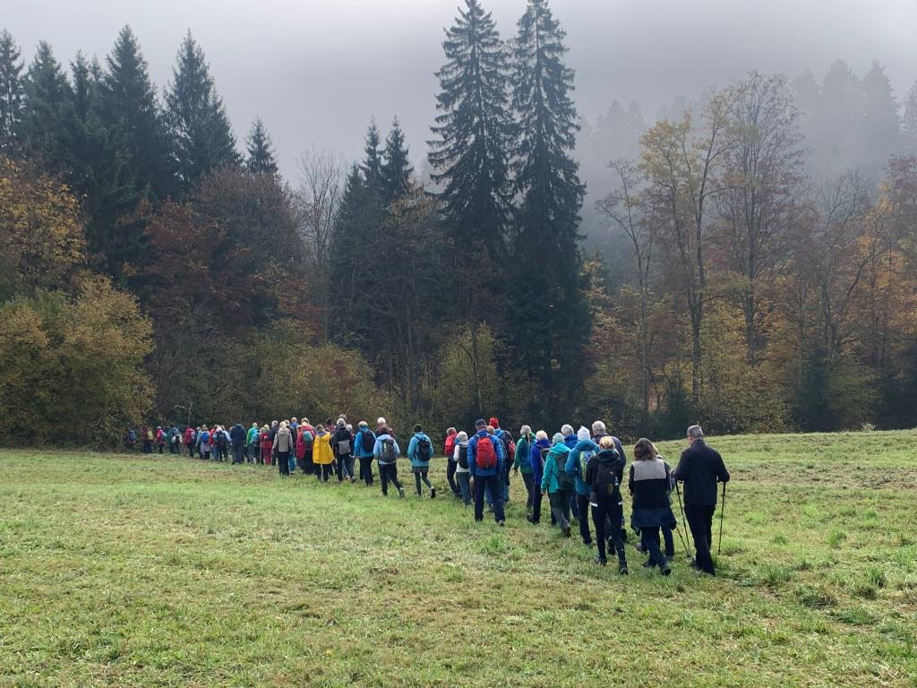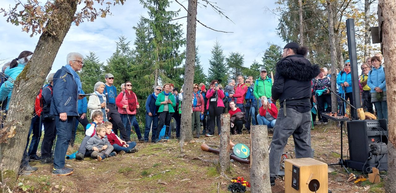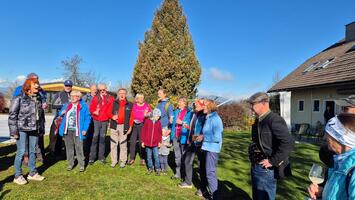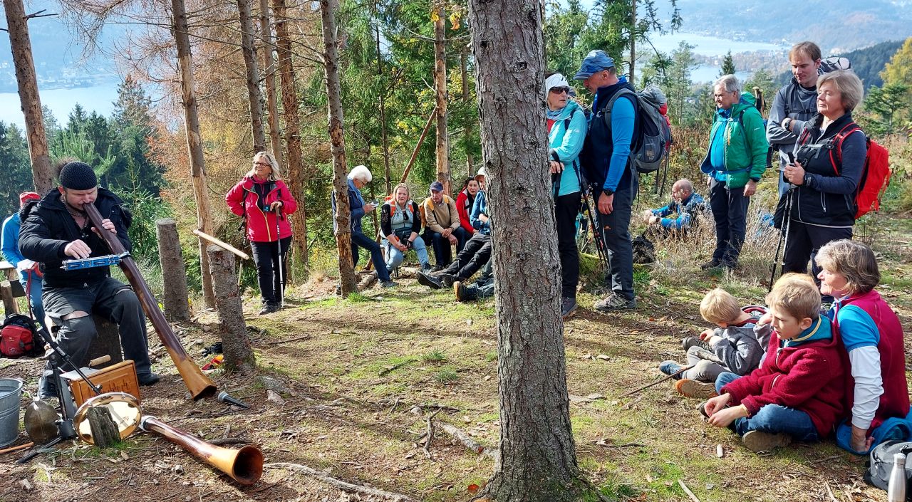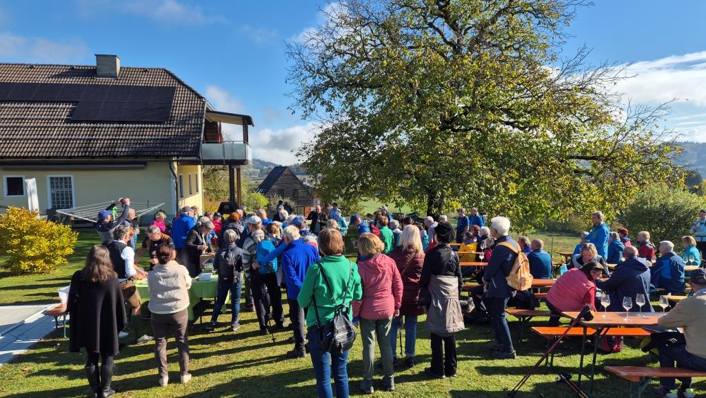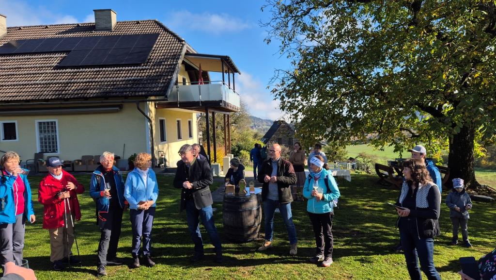 05.12.2025 Noch im tiefliegenden Nebel versammelten sich früh morgens am Nationalfeiertag die Teilnehmer an der Familiensternwanderung 2025 aus den drei Gemeinden Moosburg, Krumpendorf und Pörtschach am Bahnhof Pörtschach. Herzlich empfangen durch Obfrau Carolyn Köfer und Galeristin Elisabeth Plank wurden zur Begrüßung in der Galerie ZUGänglicheKUNST Kaffee und Kuchen kredenzt und auch die Gelegenheit geboten, die Ausstellung von Robert Krenn zu besuchen. Die Kultur war in diesem Jahr sehr hoch angeschrieben: zuerst bildende Kunst, dann Weinkultur – und schließlich musikalisch außergewöhnliche Performancekultur. Nun im Detail: Mehr als 100 Wanderer, unter anderem auch hohe politische Vertreter der Gemeinden, nahmen an dieser Familiensternwanderung teil, welche vom Bahnhof über den Kåte und den hohen Gaisrücken zur Labestation beim Karolinger Weingut in Vögelitz/Gemeinde Moosburg führte. Dort erwarteten die große Wanderschar nicht nur blauer Himmel und Sonnenschein, sondern auch eine Weinverkostung vom Feinsten. Die ambitionierten Winzer Gerfried Pink, auch bekannt als Geschäftsführer der Raiffeisen Landesbank in Pörtschach, und Robert Mack präsentierten in traumhafter Kulisse unterschiedliche Weine, welche nicht nur sehr gut mundeten, sondern alle ob ihrer Qualität begeisterten. In einem kurzen Vortrag der beiden Winzer wurde der Werdegang vom Beginn ihres Weinbaus bis hin zur mehrfachen Goldprämierung erläutert. Dazu wurde ein hausgemachter Leberkäse serviert, der ebenfalls eine Auszeichnung verdient hätte. Herzlichen Dank an die Familien Pink und Mack mit den vielen Helfern für die perfekte Umsetzung der Labestation! Weiter ging es auf den Pirkerkogel, wo bereits der bekannte Percussionist und Klangkünstler Klaus Lippitsch auf die Wandergruppe wartete. Auf Vogelstimmenpfeifen, am Didgeridoo oder mit Glocken in einem Wassereimer zauberte er eine besondere Klangwelt hervor. Eine etwas „schräge“ Performance, welche dem Publikum sehr gut gefiel. Den letzten Programmpunkt der Wandertour bildete traditionell ein gemütliches Zusammensitzen im Gemeindedreieck am Ferienhof Binz – musikalisch begleitet von den „Zsammgspielten“ und verköstigt von der Mannschaft von Pritschitz Aktiv sowie der Hausherrin Karin Binz. Zum Glück hatte sich der herannahende Regen nicht sehr beeilt und die Veranstaltung nahezu trocken enden lassen. Herzlichen Dank an alle Mitwirkenden und Helfer, aber auch an alle drei teilnehmenden Gemeinden, die Raiffeisen Länderbank und die Klimamodellregion für die finanzielle Unterstützung der Veranstaltung!