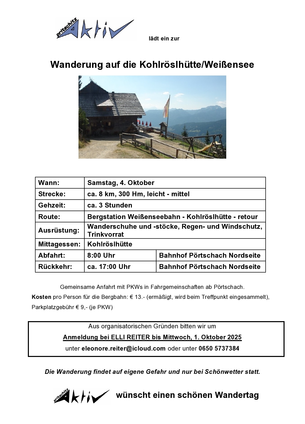 Treffpunkt um 8:30 am Bahnhof Pörtschach/Nordseite Streckenlänge 12 km, 440 Hm, mittelschwer Mittagseinkehr im Gasthaus Kohlmeister Anmeldung bis Mittwoch, 7. Mai für die Vorreservierung im Gasthaus!